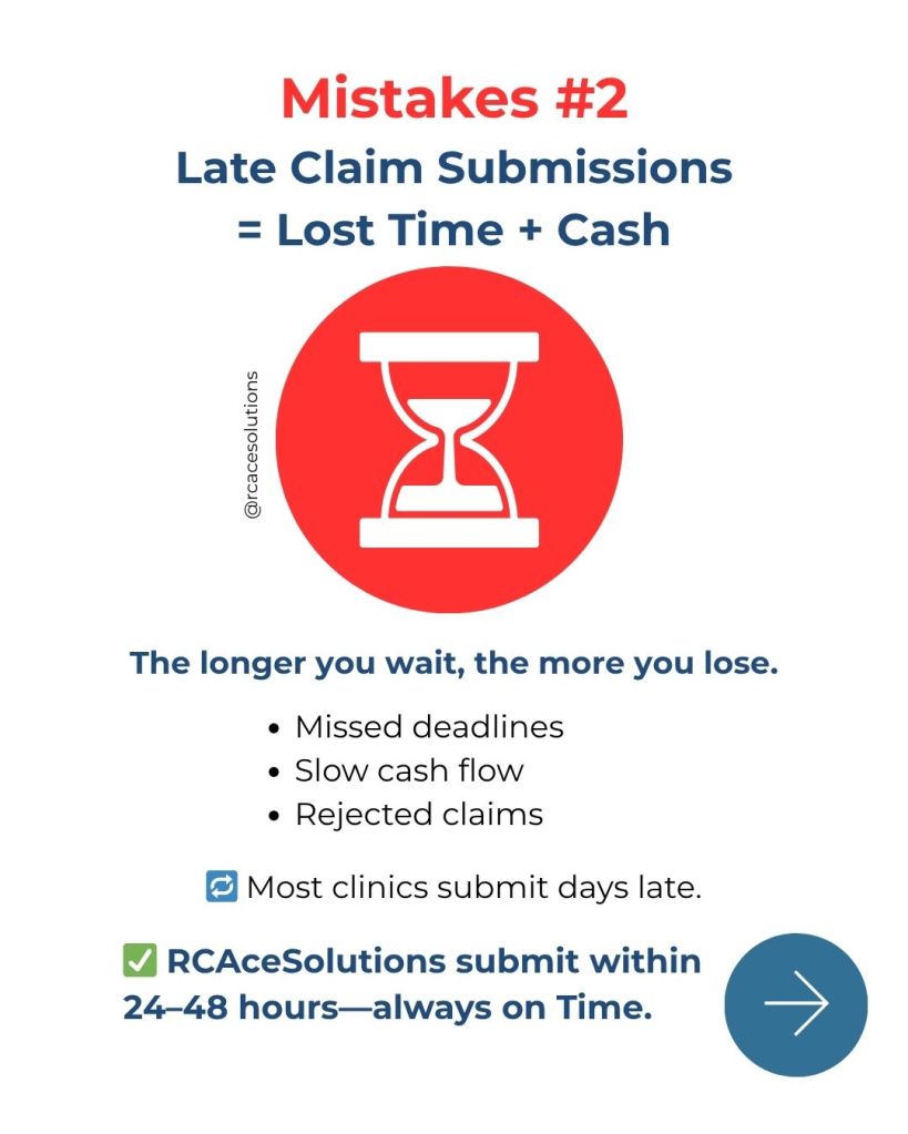 Submitting claims late is like mailing a check after the due date — insurers often reject these claims outright. Late submissions waste valuable time and create unnecessary backlog, ultimately reducing your clinic’s cash flow.